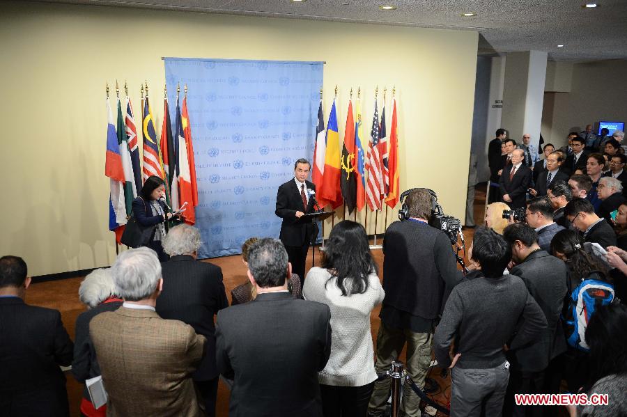 | Chinese Foreign Minister Wang Yi holds a press conference after presiding over a United Nations Security Council open debate on international peace and security at the UN headquarters in New York, the United States, on Feb. 23, 2015. (Xinhua/Niu Xiaolei) |