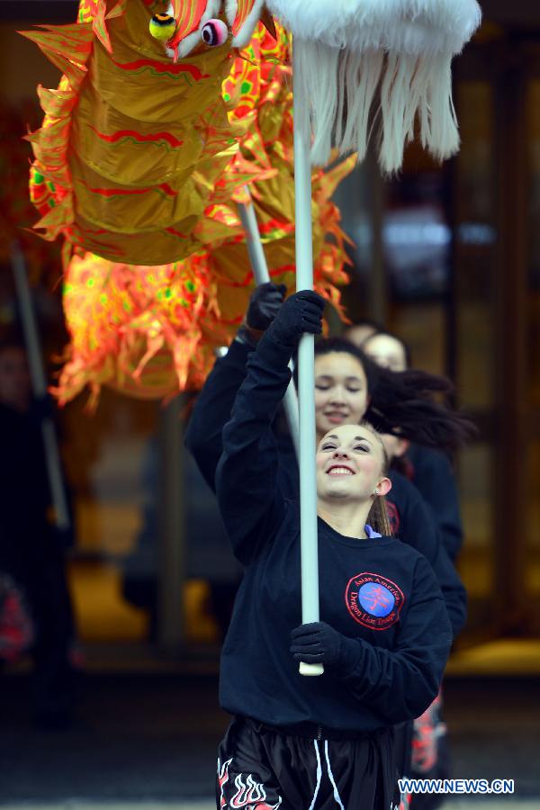 Members of the NDI (National Dance Institute) Celebration Team give a free outdoor performance as a part of the New York Philharmonic's celebration of Chinese New Year, at the Lincoln Center Plaza, New York, the United States, on Feb. 24, 2015. (Xinhua/Wang Lei)