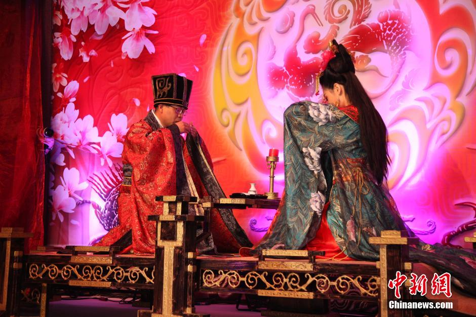 A Chinese couple wears traditional Hanfu at their wedding ceremony in Hangzhou, east China's Zhejiang province on Feb. 23, 2015. (Chinanews.com/Ye Zi)