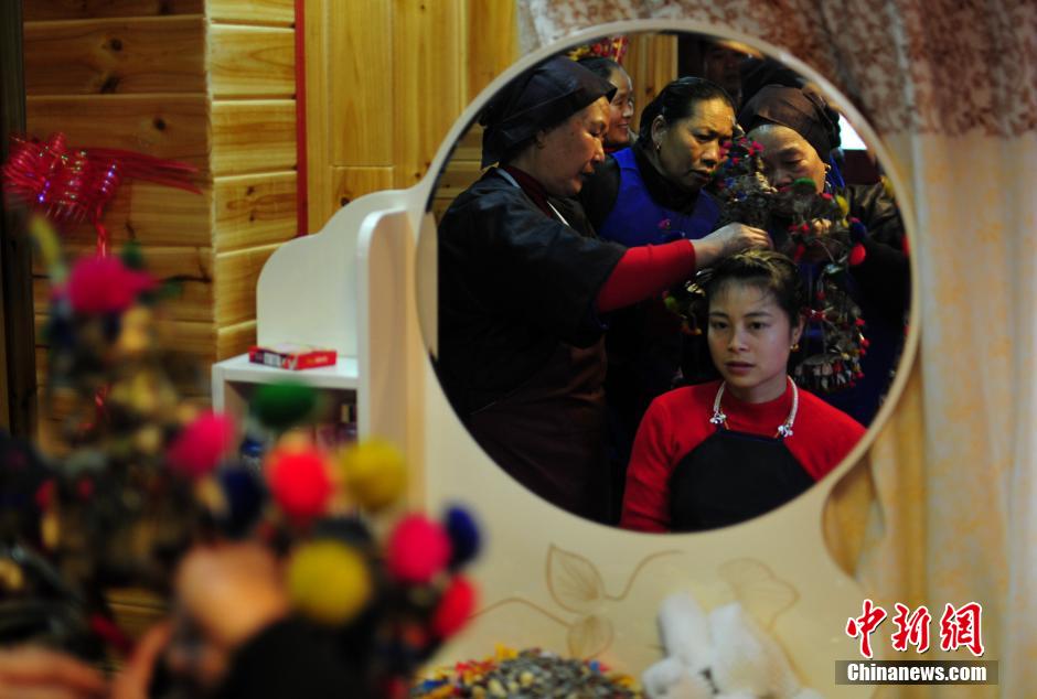 Several women dress up the bride. (Chinanews/Gong Pukang)