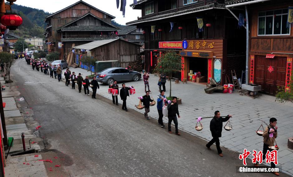 The bridal procession walks on the road. (Chinanews/Gong Pukang)