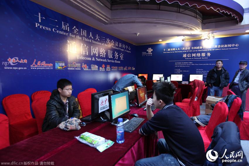 Telecommunications and network service center. The press center for the annual sessions of the National People's Congress (NPC) and the Chinese People's Political Consultative Conference (CPPCC) National Committee is under preparation for the opening of the two-week meetings in Beijing on Feb. 26, 2015. A media center for the major political meetings will open from Feb. 27 at the Media Center Hotel in Beijing. (Song Fan/dfic.cn)