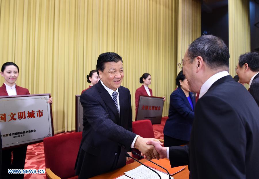 | Liu Yunshan (C), a member of the Standing Committee of the Political Bureau of the Communist Party of China (CPC) Central Committee and director of the Central Commission for Guiding Ethic and Cultural Progress, bestows honors and certificates on the advanced collectives and individuals during the National Award-issuing Conference on the Work of Cultural and Ethical Progress held in Beijing, capital of China, Feb. 28, 2015. Liu attended the conference on Saturday and delivered a speech. (Xinhua/Xie Huanchi) |