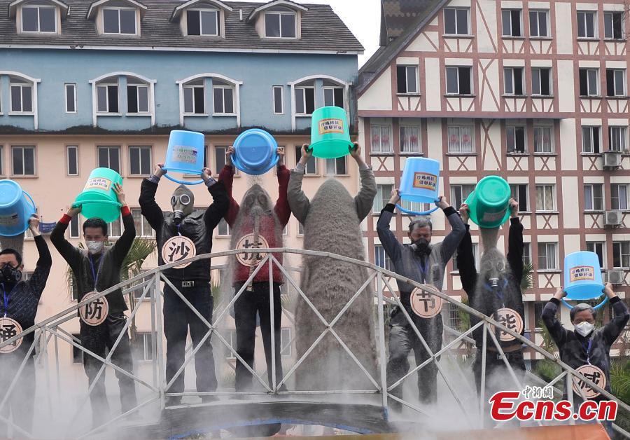 Employees of a scenic spot dump sands on themselves during an event to raise awareness of energy saving and environmental protection in Fuling, Southwest China's Sichuan province, Mar. 1, 2015. (Photo: China News Service/Chen Chao)