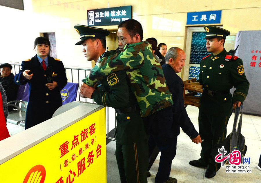 Qian Hui and Zhou Xiangqian, armed policemen of Chongqing Armed Police Corps, help Teng get on the train. (China.com.cn/Cao Feng)