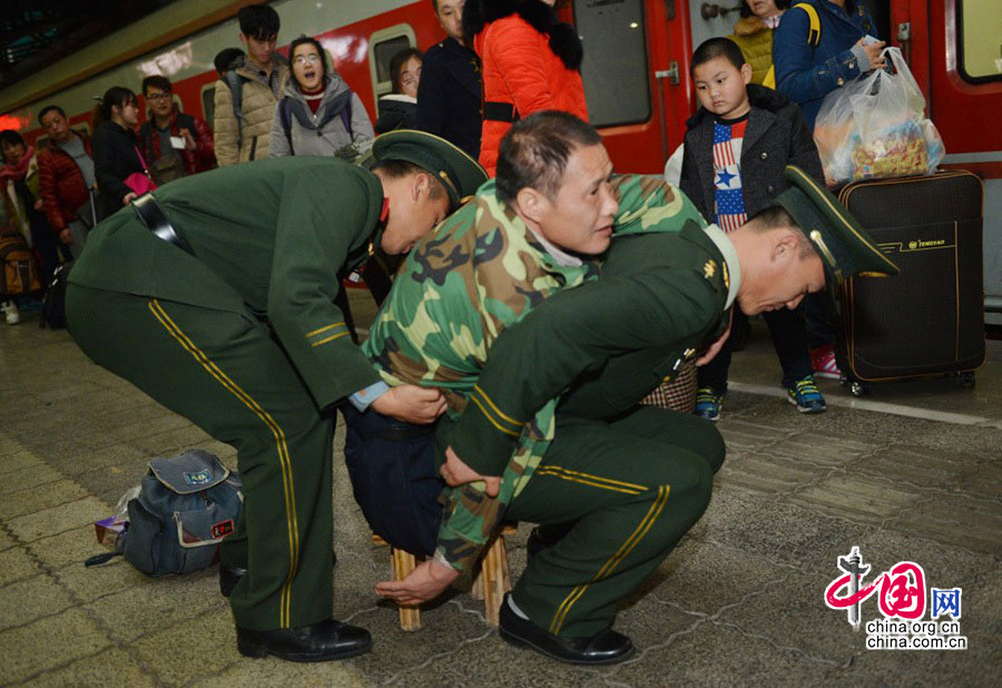 Qian Hui and Zhou Xiangqian, armed policemen of Chongqing Armed Police Corps, help Teng get on the train. (China.com.cn/Cao Feng)