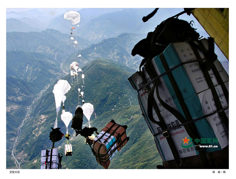 Soldiers parachute down from 5,000 meters in the air, rescuing people in this earthquake stricken area in Wenchuan county, Sichuan province on May 14, 2008. (Photo/www.81.cn)
