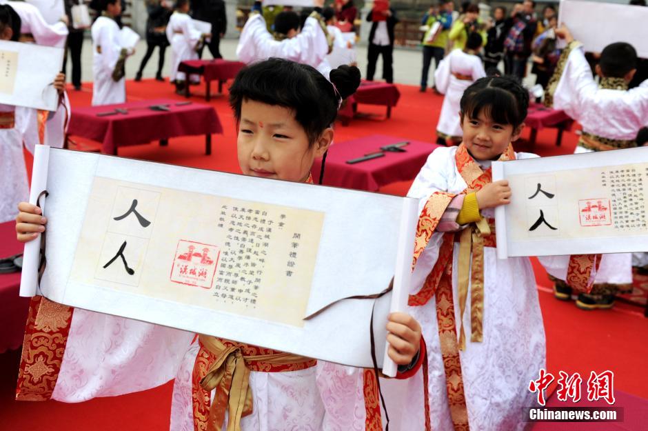 On March 1, 2015, 50 schoolchildren are dressed in China’s Han costume for their “First Writing Ceremony” by a lake in Xi’an, Shaanxi province. The First Writing Ceremony, also called Qi Meng (literally Enlightenment) Ceremony, is a very important traditional ceremony for every student before they were admitted to school. (Photo/ Zhang Yuan)
