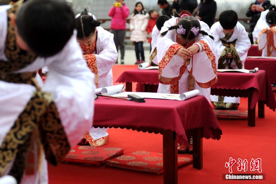 On March 1, 2015, 50 schoolchildren are dressed in China’s Han costume for their “First Writing Ceremony” by a lake in Xi’an, Shaanxi province. The First Writing Ceremony, also called Qi Meng (literally Enlightenment) Ceremony, is a very important traditional ceremony for every student before they were admitted to school. (Photo/ Zhang Yuan)