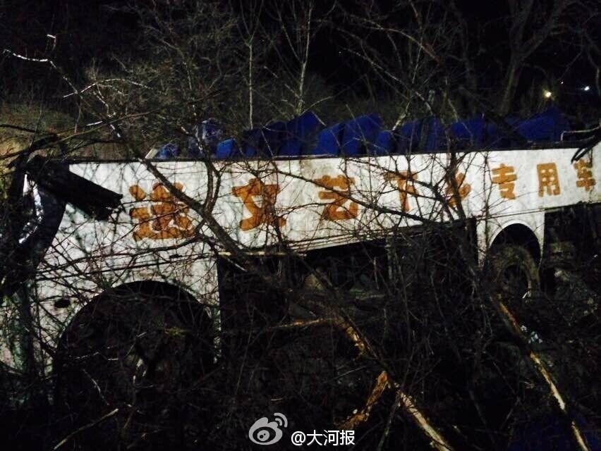 Twenty people have been confirmed dead and 13 others were injured after a coach fell off a cliff in Linzhou City, central China's Henan Province in early Tuesday morning, March 3, 2015. [Photo/Weibo]