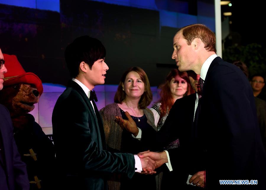 Britain's Prince William (R) shakes hands with Chinese actor Chen Xuedong, who dubbed "Paddington", during the Chinese premiere of "Paddington" at Shanghai Film Museum in Shanghai, east China, March 3, 2015. (Xinhua/Jin Liangkuai)