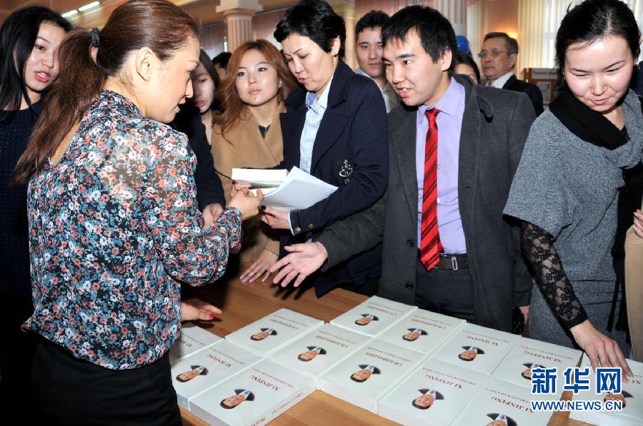 In Bishkek, Kyrgyzstan, scholars, diplomatists, politicians get the book after the book promotion on Dec. 23, 2014. (Xinhua/Luo Man)