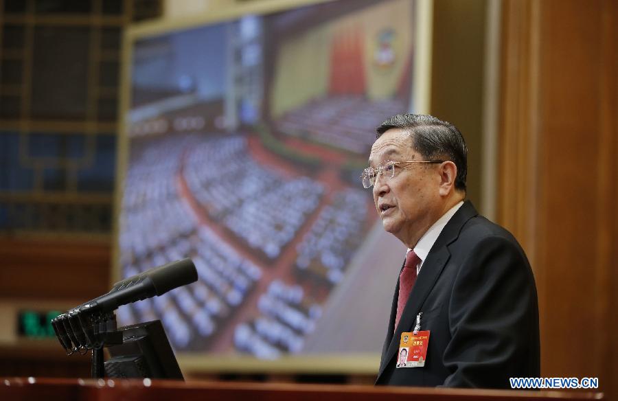 Yu Zhengsheng, chairman of the National Committee of the Chinese People's Political Consultative Conference (CPPCC), delivers a report on the work of the CPPCC National Committee's Standing Committee at the third session of the 12th CPPCC National Committee at the Great Hall of the People in Beijing, capital of China, March 3, 2015. The third session of the 12th National Committee of the CPPCC opened in Beijing on March 3. (Xinhua/Ju Peng)