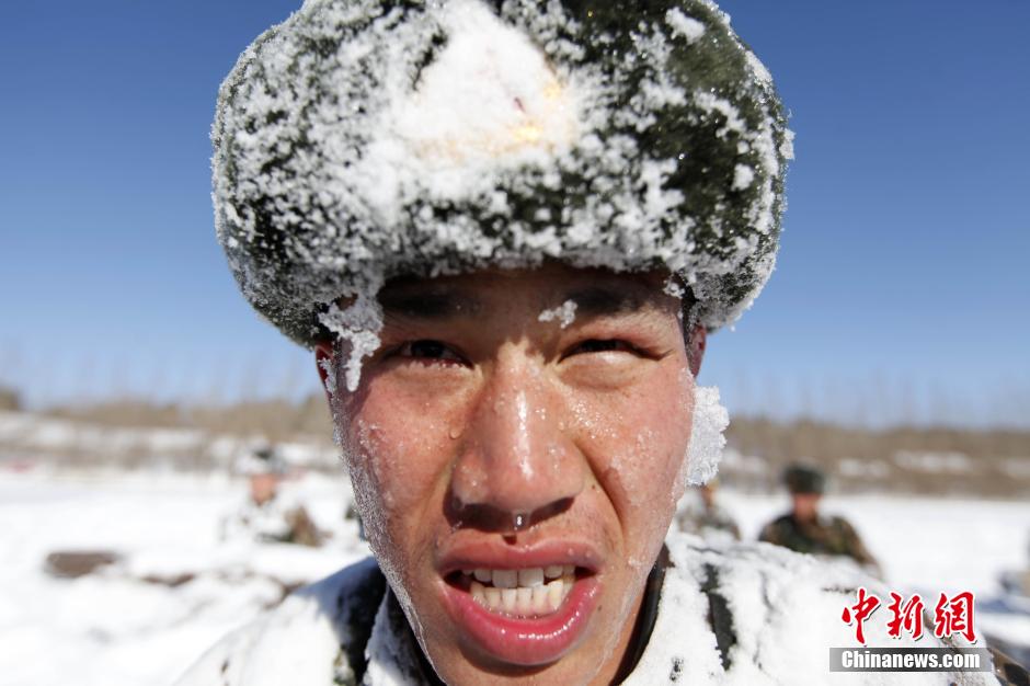 An infantry company which enjoys the title of "Tiger Company" has extreme training under harsh weather condition in Heihe city, Heilongjiang, March 2, 2015. Taking advantage of the local frigid climate, soldiers in Heihe work even harder to be qualified servicemen. (Chinanews/Wei Jianshun)