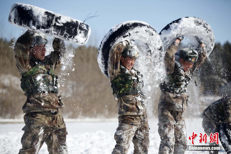 An infantry company which enjoys the title of "Tiger Company" has extreme training under harsh weather condition in Heihe city, Heilongjiang, March 2, 2015. Taking advantage of the local frigid climate, soldiers in Heihe work even harder to be qualified servicemen. (Chinanews/Wei Jianshun)