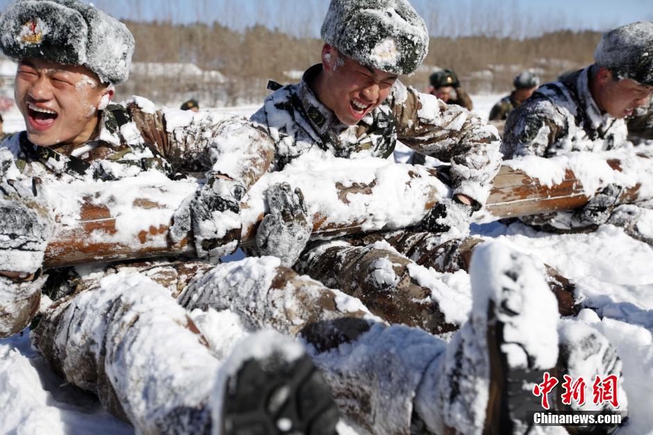 An infantry company which enjoys the title of "Tiger Company" has extreme training under harsh weather condition in Heihe city, Heilongjiang, March 2, 2015. Taking advantage of the local frigid climate, soldiers in Heihe work even harder to be qualified servicemen. (Chinanews/Wei Jianshun)