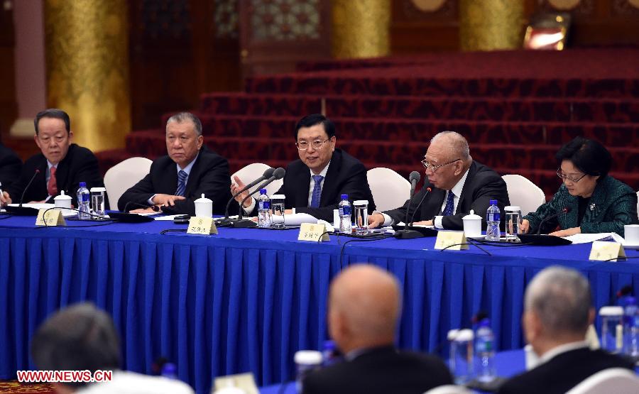 Zhang Dejiang (back, C), chairman of the Standing Committee of China's National People's Congress (NPC) and a member of the Standing Committee of the Political Bureau of the Communist Party of China (CPC) Central Committee, visits members of the 12th National Committee of the Chinese People's Political Consultative Conference (CPPCC) from the Hong Kong and Macao special administrative regions and joins their panel discussion in Beijing, capital of China, March 4, 2015. (Xinhua/Rao Aimin)