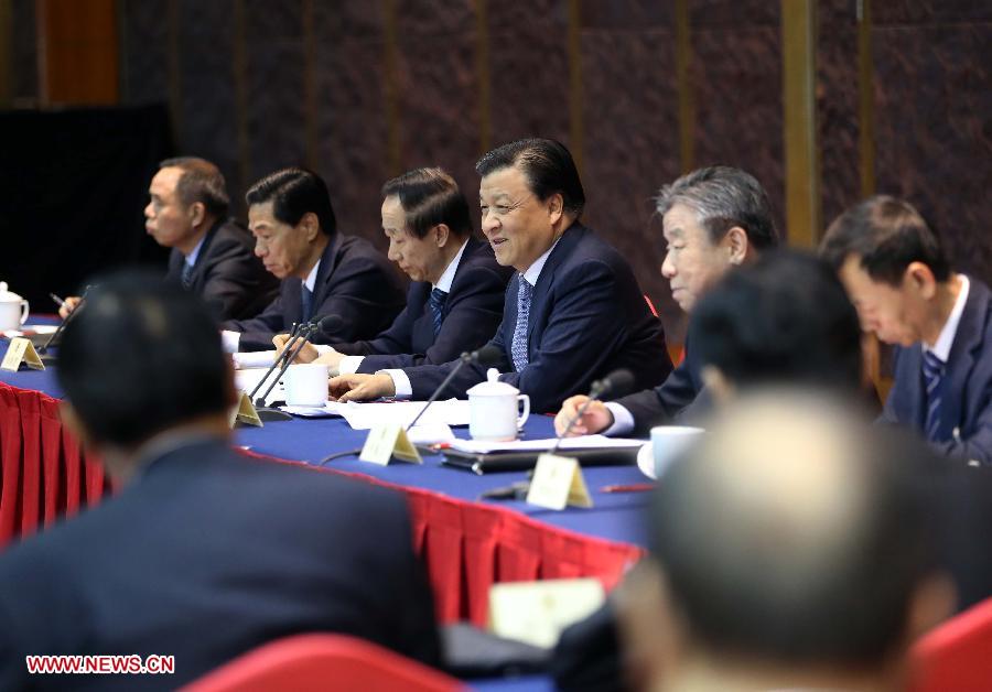 Liu Yunshan (3rd R, back), a member of the Standing Committee of the Political Bureau of the Communist Party of China (CPC) Central Committee and secretary of the Secretariat of the CPC Central Committee, visits members of the 12th National Committee of the Chinese People's Political Consultative Conference (CPPCC) from the All China Federation of Trade Unions and sectors of social welfare and security and joins their panel discussion in Beijing, capital of China, March 4, 2015. (Xinhua/Liu Weibing)