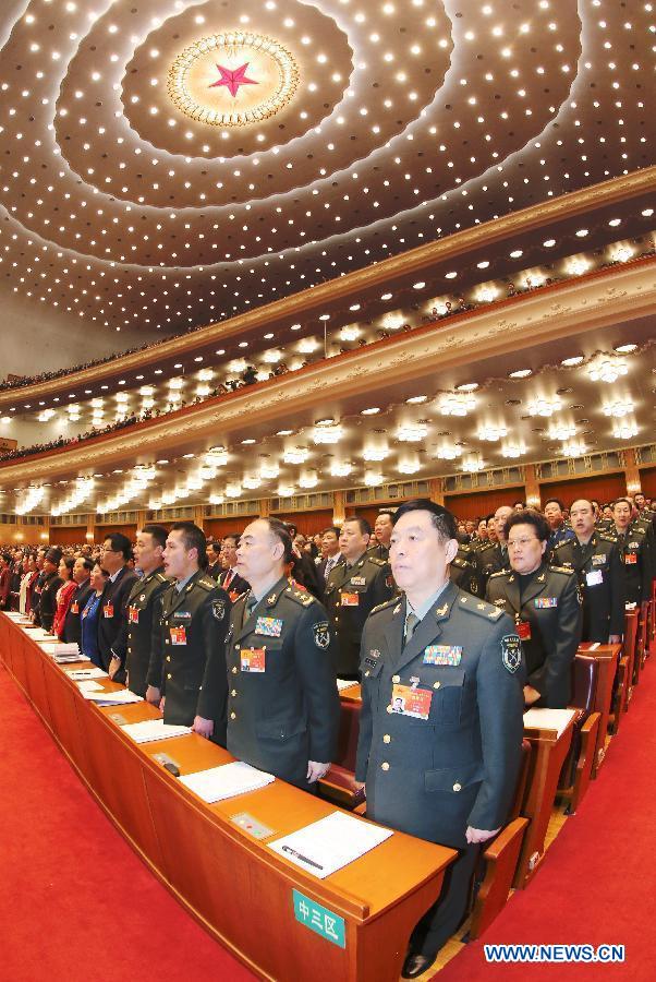 Deputies sing the national anthem during the opening meeting of the third session of China's 12th National People's Congress (NPC) at the Great Hall of the People in Beijing, capital of China, March 5, 2015. (Xinhua/Li Gang)