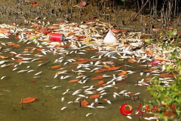 Dead fish are seen in a river in Sanya, China's southern-most island province of Hainan. (Photo/People's Daily Online)