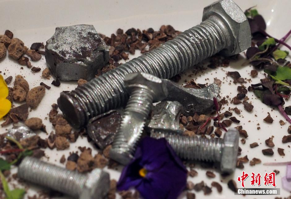 Chocolate Terracotta warriors and bolts are displayed at a reception held by the Sichuan chamber of commerce in Los Angeles on March 2, 2015. Those pieces of chocolate are made by Chinese master chef Yang Yong. (CNS/ Mao Jianjun)