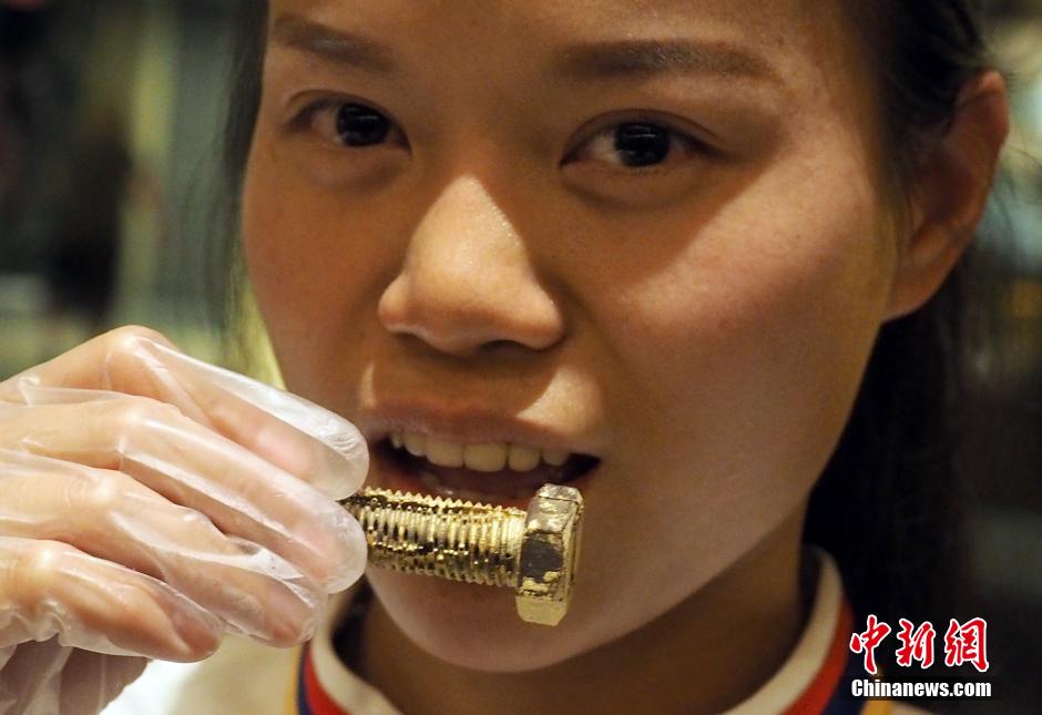 Chocolate Terracotta warriors and bolts are displayed at a reception held by the Sichuan chamber of commerce in Los Angeles on March 2, 2015. Those pieces of chocolate are made by Chinese master chef Yang Yong. (CNS/ Mao Jianjun)