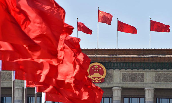 Photo taken on March 1, 2015 shows the red flags fluttering gaily in the wind over the Tiananmen Square and the Great Hall of People in Beijing. The third session of the 12th National People's Congress (NPC) and the third session of the 12th Chinese People's Political Consultative Conference (CPPCC) are to open in Beijing on Thursday and Tuesday respectively. (People.cn/Photo)