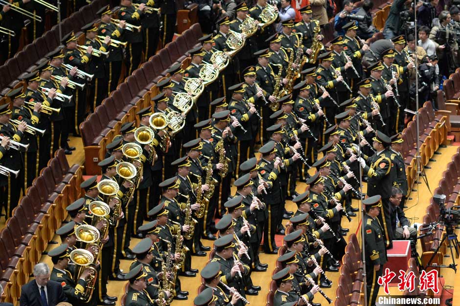 Military band plays at the opening meeting of the third session of the 12th National People's Congress. (Photo/Chinanews.com)