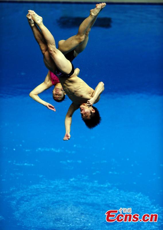 Sun Mengchen and Zhang Qi compete in the mixed synchronized 3m springboard final during the China Diving Championships in Wuhan, Central China’s Hubei province, March 6, 2015. The mixed synchronized events make their debut in the national championships. (Photo: China News Service/Zhang Chang)