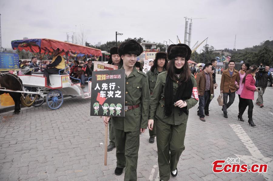 Foreign volunteers dress as China’s role model Lei Feng work on the Foreigner Street in Southwest China’s Chongqing municipality, March 5, 2015. Lei, a young Chinese soldier in the 1960s, is known for devoting almost all of his spare time and money to selflessly helping the needy. He died after being hit by a falling pole while helping a fellow soldier direct a truck on August 15, 1962. A year later, Chairman Mao called on the nation to follow Lei's example, and March 5 of every year is designated "Lei Feng Day". (Photo: China News Service/Chen Chao)