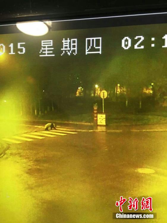 In the video, the giant panda at first appeared in the green belt near a scenic spot and then crossed the street. It tried to enter the scenic spot by clinging to the iron gate, but unsuccessfully. Then it crossed two zebra crossings, and finally entered the scenic spot by jumping over the flower bed area. At last it disappeared in the darkness. According to the manager of the scenic spot, the panda did not show up again.