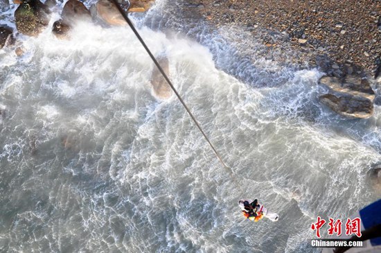 North Sea Rescue team sends a helicopter to save a man who accidentally fell off a cliff on an island in Bohai Bay, Changdao county, Shandong province on the afternoon of March 4,2015.(CNS/ Xie Yuanlei)