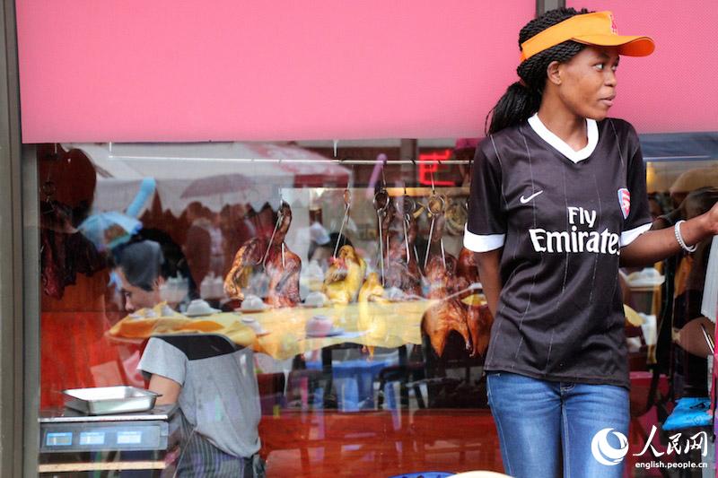 A South African staff leans against the wall outside a Cantonese restaurant, waiting for the event to start. (People's Daily Online/ Zhang Jiexian)