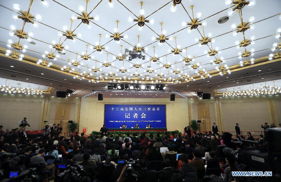 Chinese Minister of Commerce Gao Hucheng gives a press conference for the third session of China's 12th National People's Congress (NPC) on commercial development and opening up, in Beijing, capital of China, March 7, 2015. (Xinhua/Xing Guangli)