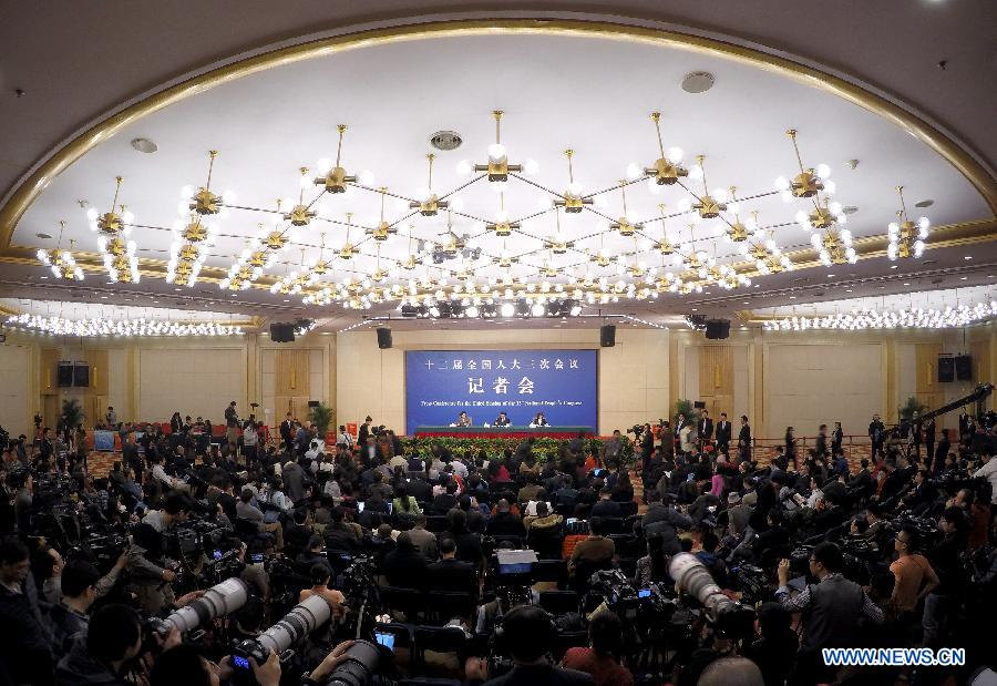 Chinese Minister of Commerce Gao Hucheng gives a press conference for the third session of China's 12th National People's Congress (NPC) on commercial development and opening up, in Beijing, capital of China, March 7, 2015. (Xinhua/Li Xin)