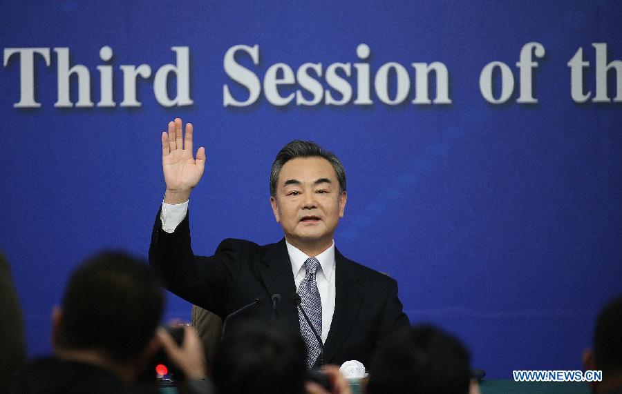 Chinese Foreign Minister Wang Yi gestures during a press conference for the third session of China's 12th National People's Congress (NPC) in Beijing, capital of China, March 8, 2015. (Xinhua/Xing Guangli)