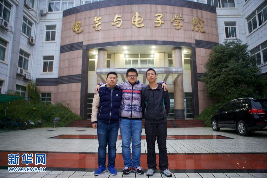 Zhang Hailong (middle) and his friends Nie Minlin (left) and Huang Wanming on March 2, 2015. (Xinhua/Hu Chenhuan)