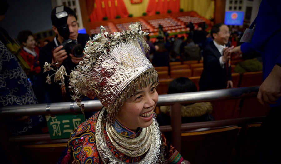 A woman deputy to the National People's Congress from Chinese ethnic minority group is at the opening ceremony of the third session of the 12th National People's Congress (NPC). (AFP Photo)