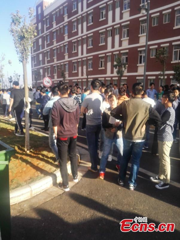 | A picture taken by cell phone shows university students gather on the campus after an earthquake in Songming county, Southwest China's Yunnan province, March 9, 2015. A 4.6-magnitude earthquake jolted the county on Monday, with the epicenter located about 50 km from Kunming, capital city of the province. (Photo: China News Service/Zhe Yanyu) |