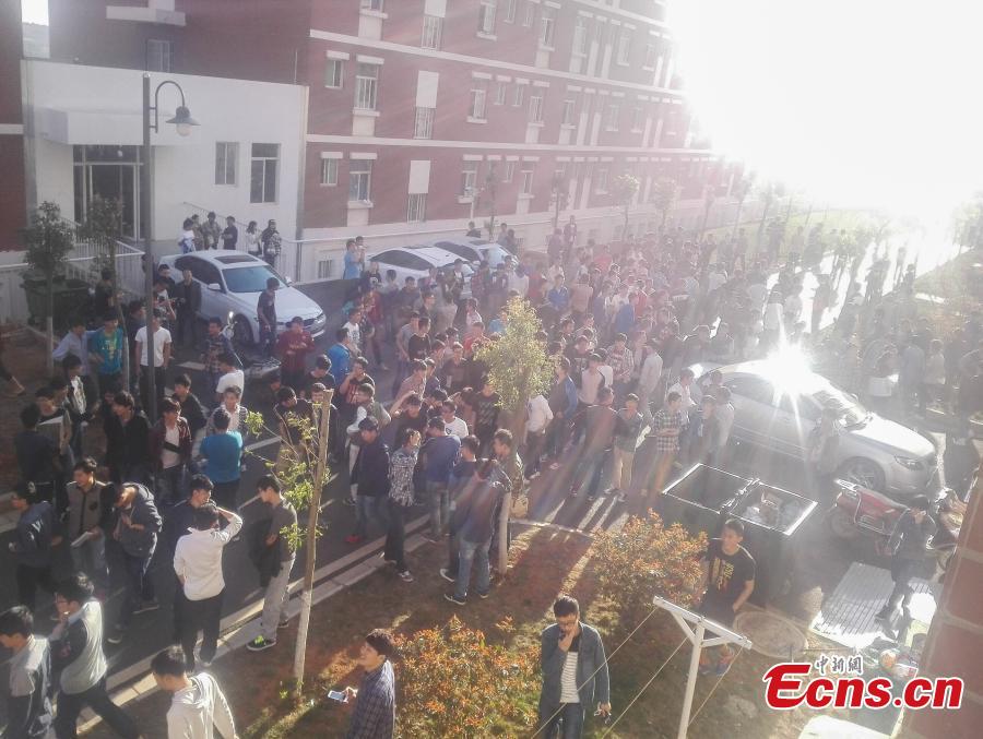 A picture taken by cell phone shows university students gather on the campus after an earthquake in Songming county, Southwest China's Yunnan province, March 9, 2015. A 4.6-magnitude earthquake jolted the county on Monday, with the epicenter located about 50 km from Kunming, capital city of the province. (Photo: China News Service/Zhe Yanyu)