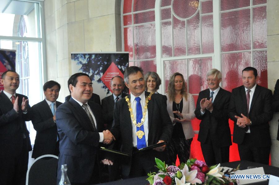 Wang Guangzheng (Front, L), vice mayor of China's Qingdao, shakes hands with Dave Cull (Front, R), mayor of New Zealand's Dunedin, as they exchange the copies of Friendship City Agreement in Dunedin, March 11, 2015. Dunedin, the South Island's second largest city and also one of New Zealand's major technology and education powerhouses, is consolidating its city links with China's eastern seaboard. (Xinhua/Su Liang)