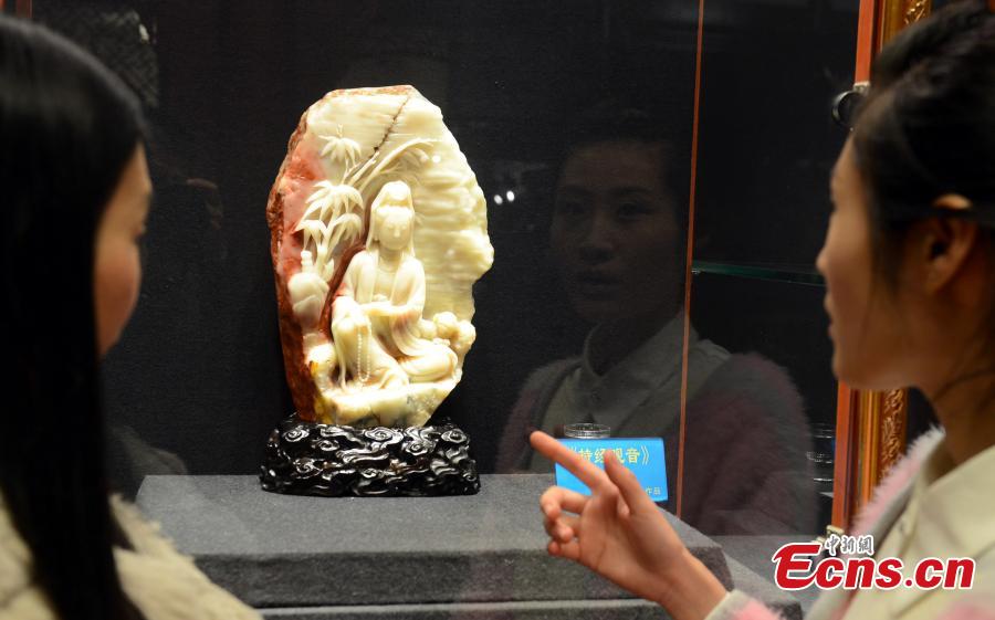 A Shoushan stone carving is on display in Fuzhou, East China’s Fujian province, March 10, 2015. The national and provincial masters present about 20 Shoushan stone carvings featuring a broad range of topics, such as Buddhist figures, in the exhibition. With a soft, smooth surface and various colors, Shoushan stone from a mountain called Shoushan in the province, is an ideal material for carving and is known as "the top grade-colored stone for carving." It is characterized by exquisiteness, smoothness, softness, and cohesion. (Photo: China News Service/Liu Kegeng)