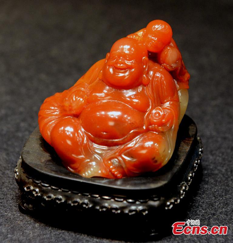 A Shoushan stone carving is on display in Fuzhou, East China’s Fujian province, March 10, 2015. The national and provincial masters present about 20 Shoushan stone carvings featuring a broad range of topics, such as Buddhist figures, in the exhibition. With a soft, smooth surface and various colors, Shoushan stone from a mountain called Shoushan in the province, is an ideal material for carving and is known as "the top grade-colored stone for carving." It is characterized by exquisiteness, smoothness, softness, and cohesion. (Photo: China News Service/Liu Kegeng)