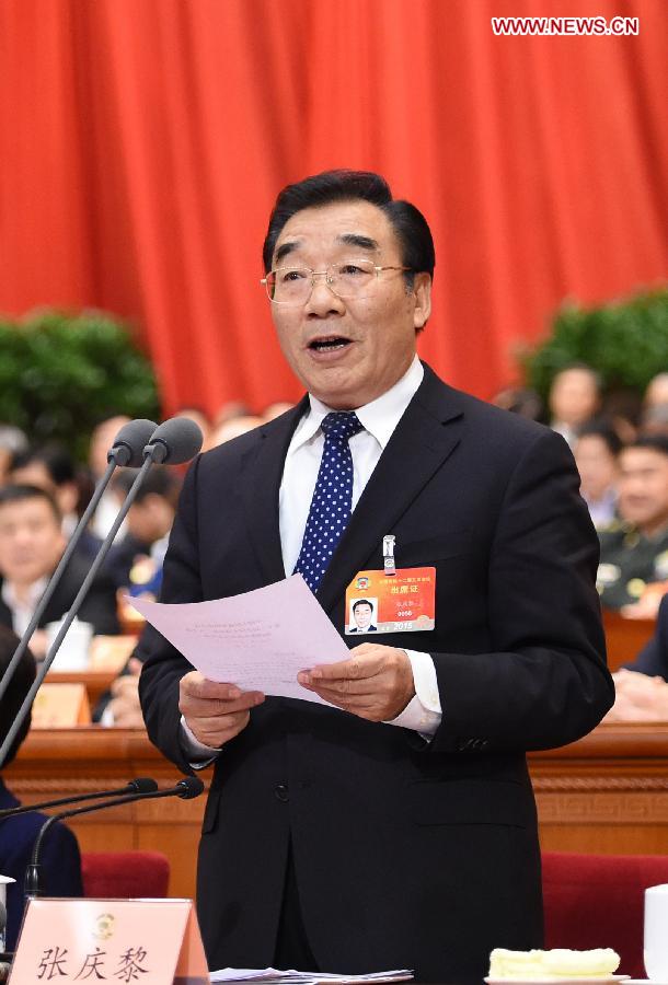 | Zhang Qingli, vice-chairperson of the 12th National Committee of the Chinese People's Political Consultative Conference (CPPCC), presides over the fourth plenary meeting of the third session of the 12th CPPCC National Committee at the Great Hall of the People in Beijing, capital of China, March 11, 2015. (Xinhua/Li Xueren) |
