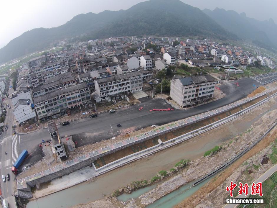 Two buildings block a provincial road in east China’s Zhejiang province. (CNS/Chang Kong)