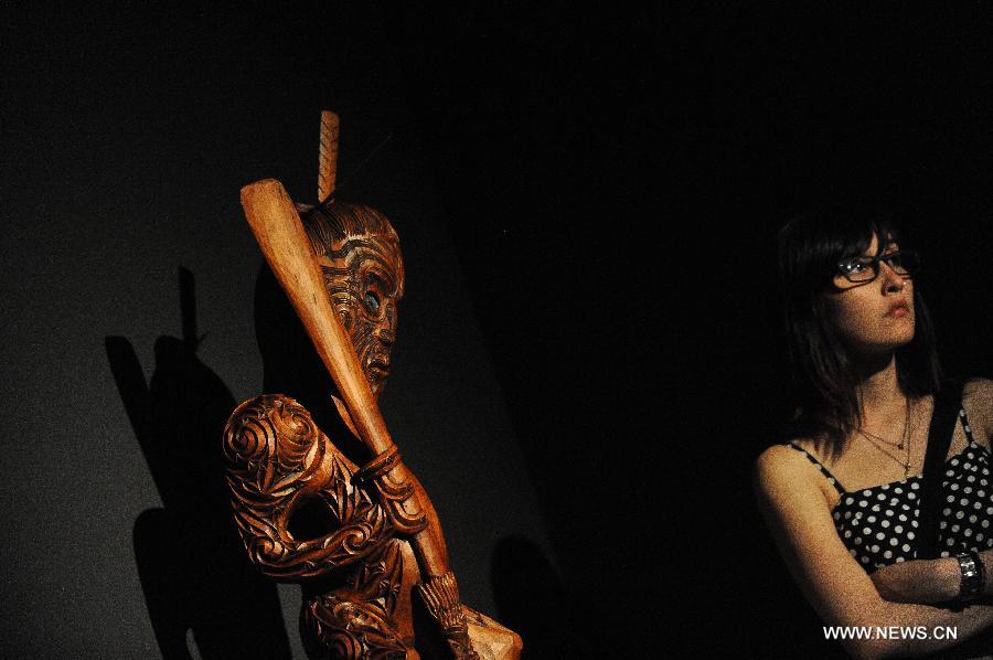 A visitor visits the exhibition "Tuku Iho: Legacy Live" at the Cultural Center of Gabriela Mistral, in Santiago, capital of Chile, on March 11, 2015. According to local press, the exhibition "Tuku Iho: Legacy live", presents more than 80 pieces of Maori art wood carvings, stone, bone and jade, as well as various types of embroidery. (Xinhua/Jorge Villegas)