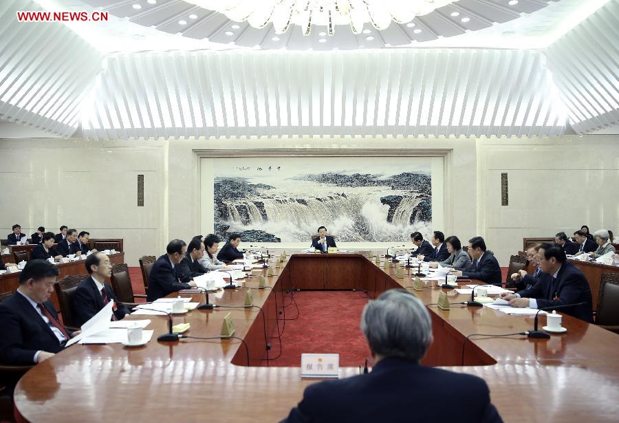 Zhang Dejiang (back, C), executive chairperson of the presidium of the third session of China's 12th National People's Congress (NPC) and chairman of the NPC Standing Committee, presides over the first meeting of the presidium's executive chairpersons at the Great Hall of the People in Beijing, capital of China, March 11, 2015. (Xinhua/Lan Hongguang)