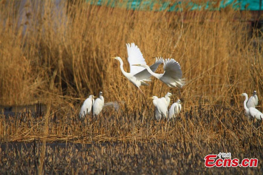 A flock of egrets are seen at the National Wetland Park in Zhangye city, Northwest China’s Gansu province, March 10, 2015. The wetland, with a planned area of 4,100 hectares, severs as an important source of drinking water and for feeding for migratory birds. (Photo: China News Service/Chen Li)