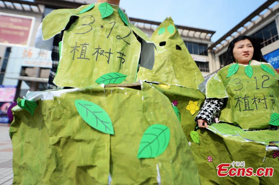 University students present creations made of newspapers, paper bags and other waste materials during an event in Yangzhou, East China’s Jiangsu province, March 11, 2015. The event aimed to promote public awareness of environmental protection and introduce knowledge of afforestation ahead China’s national Tree Planting Day celebrated on March 12 each year.(Photo: China News Service/Meng Delong)