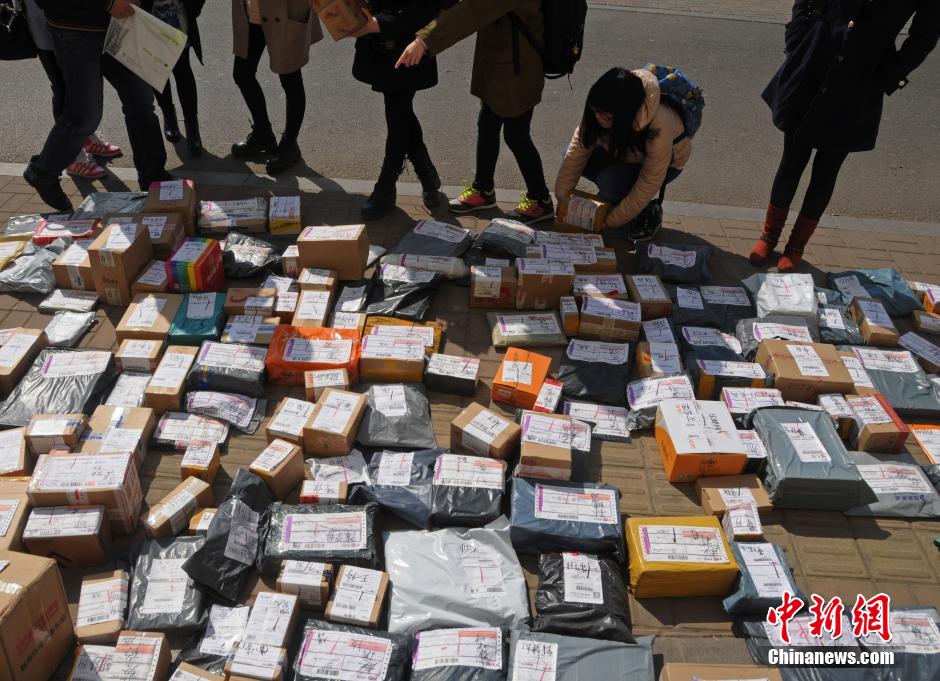 Students look for their packages outside a university campus in Taiyuan, north China's Shanxi province on March 10, 2015. (Photo/Chinanews.com)